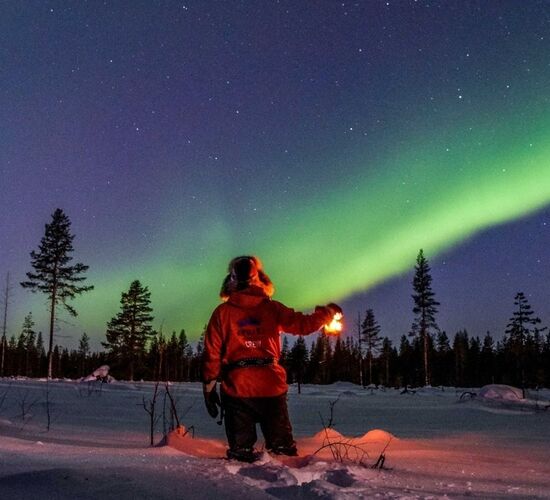 Kuscheln Sie mit freundlichen, flauschigen Huskys, genießen Sie eine heiße und gemütliche finnische Sauna direkt vor Ihrer Haustür, erkunden Sie die Wildnis mit dem Schneemobil, gehen Sie auf Nordlichtjagd im Pferde-Schlitten und entdecken Sie die arktische Natur auf Schneeschuhen.