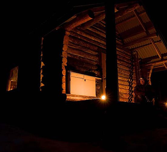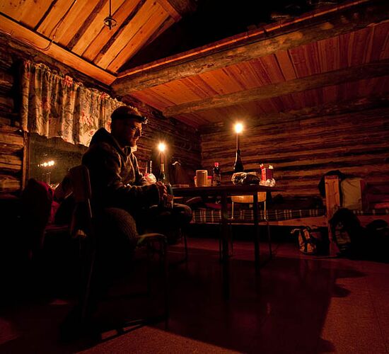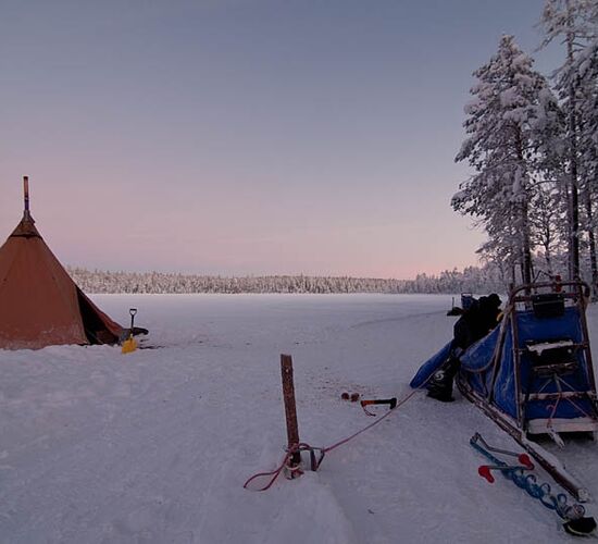 Verbringen Sie die Nächte in einem Leinwandzelt und Holzhütten. Holen Sie Wasser aus einem Eisloch im gefrorenen See und fühlen Sie die Wärme des glühenden Feuers im Holzofen. Sehen Sie Spuren von wilden Tieren und erleben Sie das wahre Leben in der Wildnis sowie den berührenden Kontakt mit den Schlittenhunden.