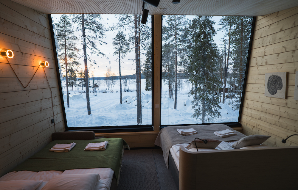 Das 33 qm große Arctic Sky Nest ist perfekt für alle, die eine Kombination aus finnischem Design, Komfort und der atemberaubenden Schönheit der Natur suchen. Mit großem Fenster haben Sie einen tollen Blick auf den Nachthimmel und können mit etwas Glück die Nordlichter direkt von Ihrem Doppelbett aus beobachten. Die "Nester" sind mit einem eigenen Badezimmer und einem Sofabett für zwei weitere Personen ausgestattet und bieten alle Annehmlichkeiten, die Sie für Ihren Aufenthalt benötigen. Zusätzlich ist der tägliche Eintritt in die Arctic Sauna World im Preis inbegriffen, sodass Sie nach einem Tag voller Abenteuer entspannen und sich in der wohltuenden Wärme der verschiedenen Saunen zurücklehnen können.