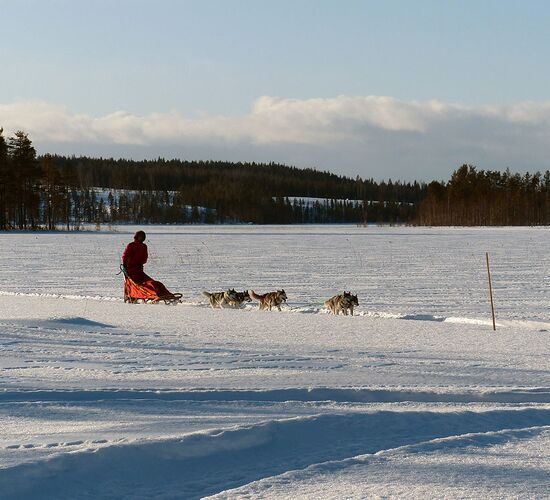 After breakfast, it's time for you and the dogs to set off on the snow-covered trails. After an introduction, you will experience the winter landscape in harmony with your dog team. In the remote South Lapland, you will become one with nature and your sled dog team. Today's tour will take you across frozen lakes and rivers, over small mountains, and through snow-covered pine forests. After a few hours of exploring, enjoy lunch around an open campfire. You will arrive back at the dog farm in the late afternoon. Dinner will be served at 7:30 p.m in the guest house at the husky farm. In a relaxed atmosphere, you can review the experiences of the day with the group and discuss your favourite highlights. On this evening, you will move into one of the special Aurora tipis with a glass roof, which offers you optimal conditions for sighting the Northern Lights.