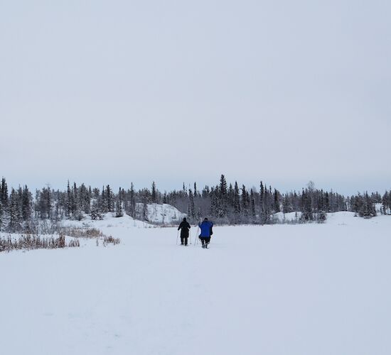 After breakfast at the Tulita Hotel, you drive to Délı̨nę (130 km), crossing frozen rivers and snow-covered plateaus. Once you arrive in Délı̨nę, you move into the Grey Goose Lodge with a view of the frozen Great Bear Lake. Here you will go ice fishing with indigenous guides and enjoy homemade lunch with local ingredients. You then switch to a snowmobile and explore the icy shoreline. For dinner, you will find yourself in the lodge dining room, surrounded by Northern art, stories and cultural performances such as the traditional drum dance.