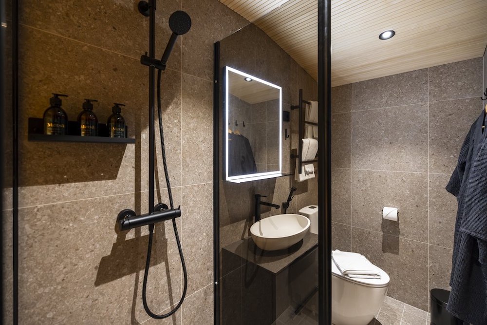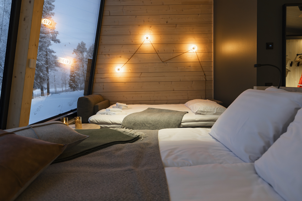 The Arctic Glass Suite combines Finnish design with the charm of log wood and big windows that offer spectacular views of the river, the Arctic sky and hopefully the Northern Lights. It has a cosy lounge area, a bathroom and a private sauna where you can relax after an eventful day. With a double bed for two adults and a sofa bed that can accommodate two additional guests, the suite is ideal for small families or couples.